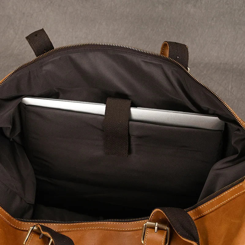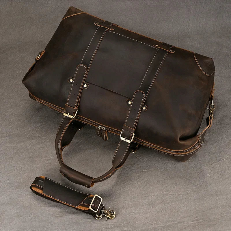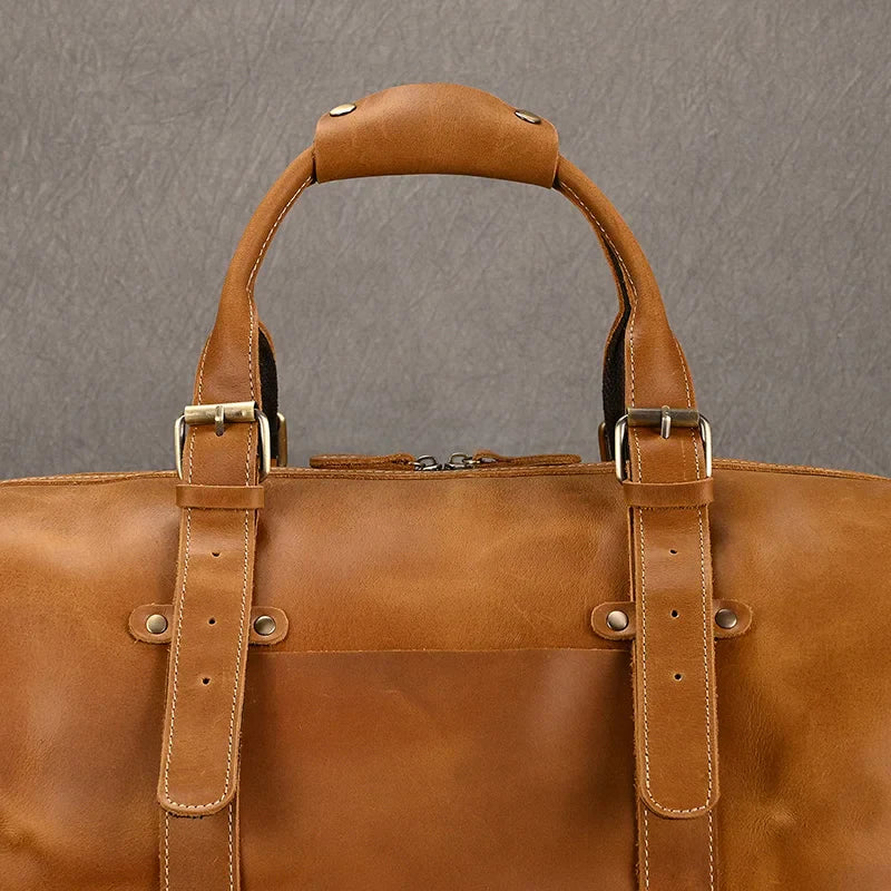 Reis met vertrouwen en stijl — deze leren duffeltas is je perfecte metgezel.