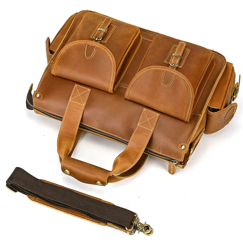 Crafted entirely by hand from imported full-grain cowhide, this briefcase blends rugged durability with refined style. The leather’s natural grain ages into a rich patina, while reinforced stitching and solid metal hardware ensure it stands up to daily commutes and business travel.